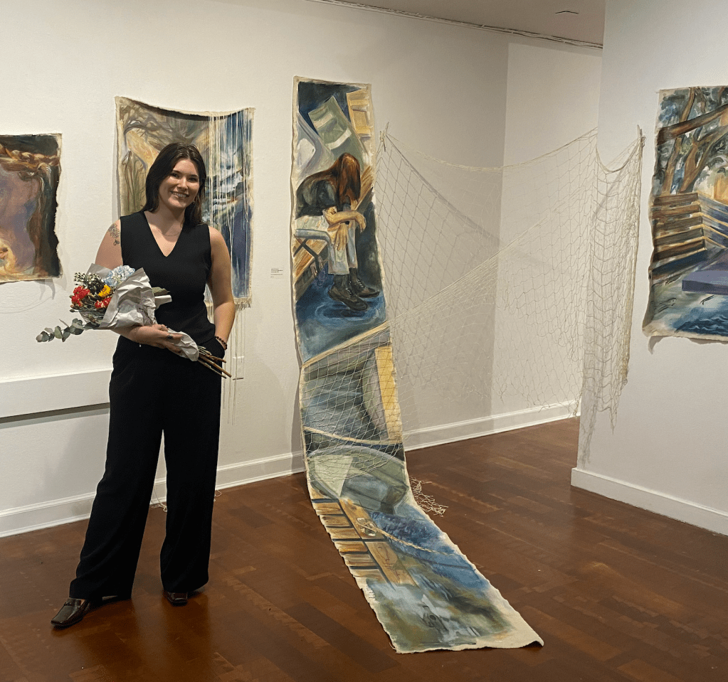 Sabrina McCranels is a recent graduate of Florida Atlantic University after receiving a Bachelors of Fine Arts degree in Studio Art. Through their art practice, McCranels explores the complex and often conflicting emotions manifested in both interpersonal and intrapersonal relationships. Their current chosen medium is oil paint on unstretched canvas to allow for various physical manipulation to the substrate itself. Calling upon themes of shame, trust, permanence versus impermanence and manipulation versus transparency, McCranels cultivates an artistic voice that bridges the physical and metaphysical worlds that hold us. Her pieces serve as meditations on the unseen forces that govern these connections. By providing a space for these emotions to unfold, they hope to create an opportunity for viewers to engage in reflection. She encourages intimacy and the potential for reconnection in a world where such connections are increasingly fragile and far between.